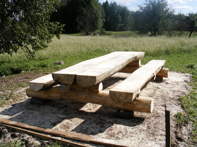 isegi magamiseks ei jäänud tihtipeale aega. Alguses plaanisin ühe katuse ära teha, aga kuna laastu oli võimatu nii kiiresti saada otsustasin hoopis Ruusmäel midagi kasulikku teha. Nii sai otsustatud ehitada sinna üks väli laud koos pinkidega. Mõeldud tehtud. Esmalt tuli muidugi metsa suunduda ja sealt vajalik materjal muretseda. Hiljem need saekaadris parajaks lõigata ja lõpuks kokku sobitada. Sellele kulus päris mitu päeva ja täielikult valmis see ei saanudki. Lihvimine jäi järgmisesse aastasse.